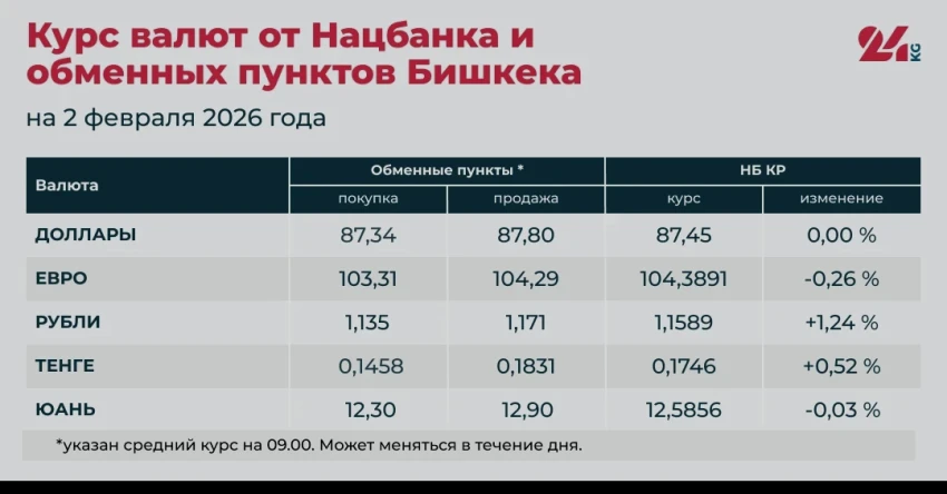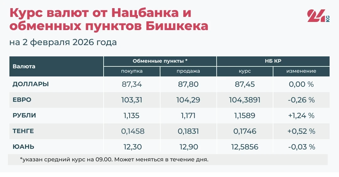 Согласно данным, предоставленным Национальным банком Кыргызстана и обменными пунктами Бишкека, официальный курс российского рубля и казахского тенге увеличился, тогда как евро и китайский юань отметили снижение. Курс доллара остается на стабильном уровне.