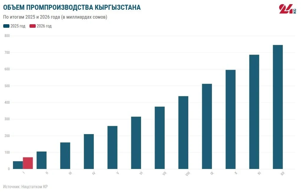 Объем промышленного производства в январе 2026 года достиг 69 миллиардов 831,1 миллиона сомов, что на 12,6% больше по сравнению с предыдущим годом. Это увеличение произошло благодаря росту в следующих отраслях: