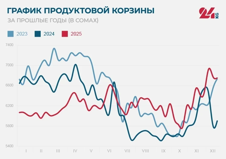 В течение 2025 года стоимость продуктовой корзины возросла на 686 сомов. Наименьшая цена была зарегистрирована 18 октября — 5 тысяч 791 сом, а максимальная достигла 6 декабря — 6 тысяч 927 сомов.