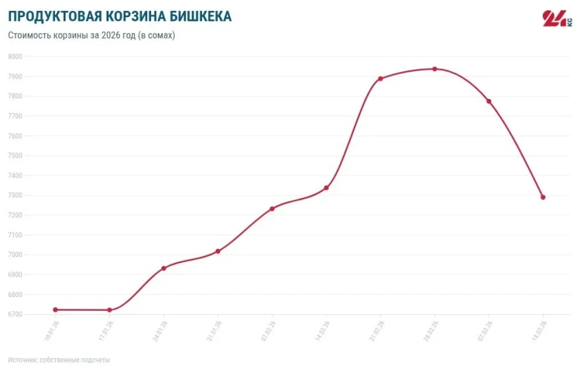 С начала нашего исследования, начатого в октябре 2018 года, стоимость продуктовой корзины увеличилась на 4 тысячи 20 сомов. С начала текущего года рост составил 567 сомов, а в сравнении с аналогичным периодом 2025 года — 1 тысяча 147 сомов.