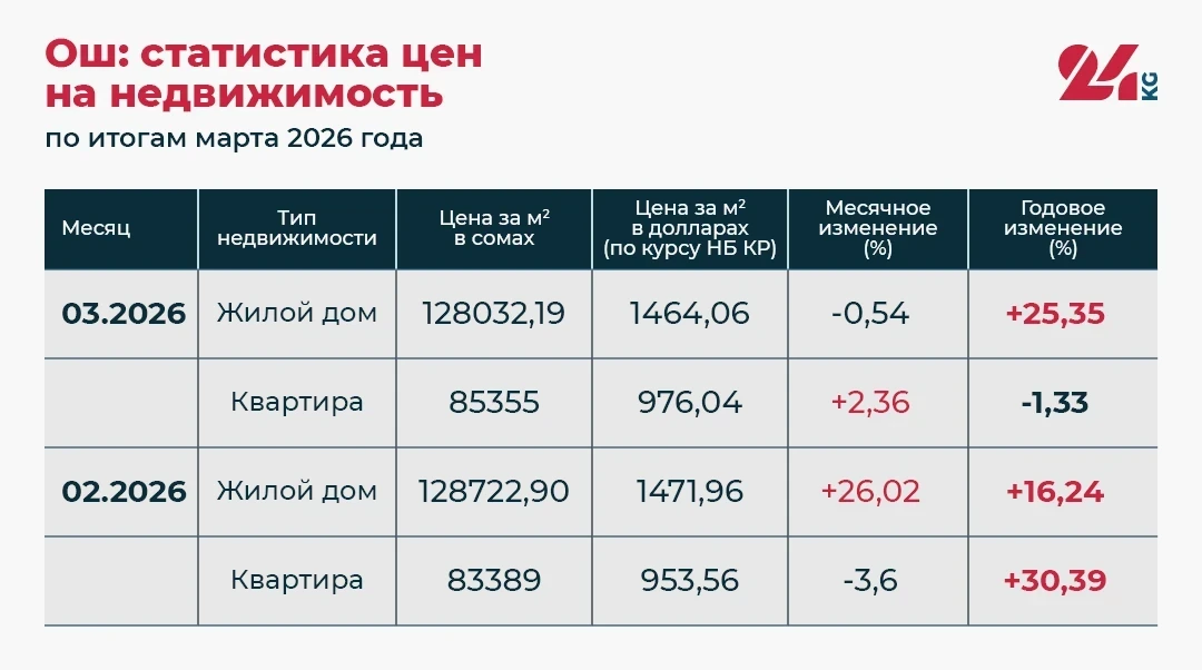В Оше, наоборот, наблюдается небольшая стабилизация: в марте цены на жилые дома снизились на 0,54 процента после резкого роста в феврале, а квартиры подорожали на 2,36 процента.