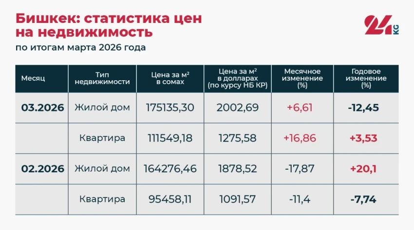 Минимальные цены на дома были зафиксированы в мае прошлого года (68 010,79 сома), а на квартиры — в феврале 2025 года (63 951,77 сома).
