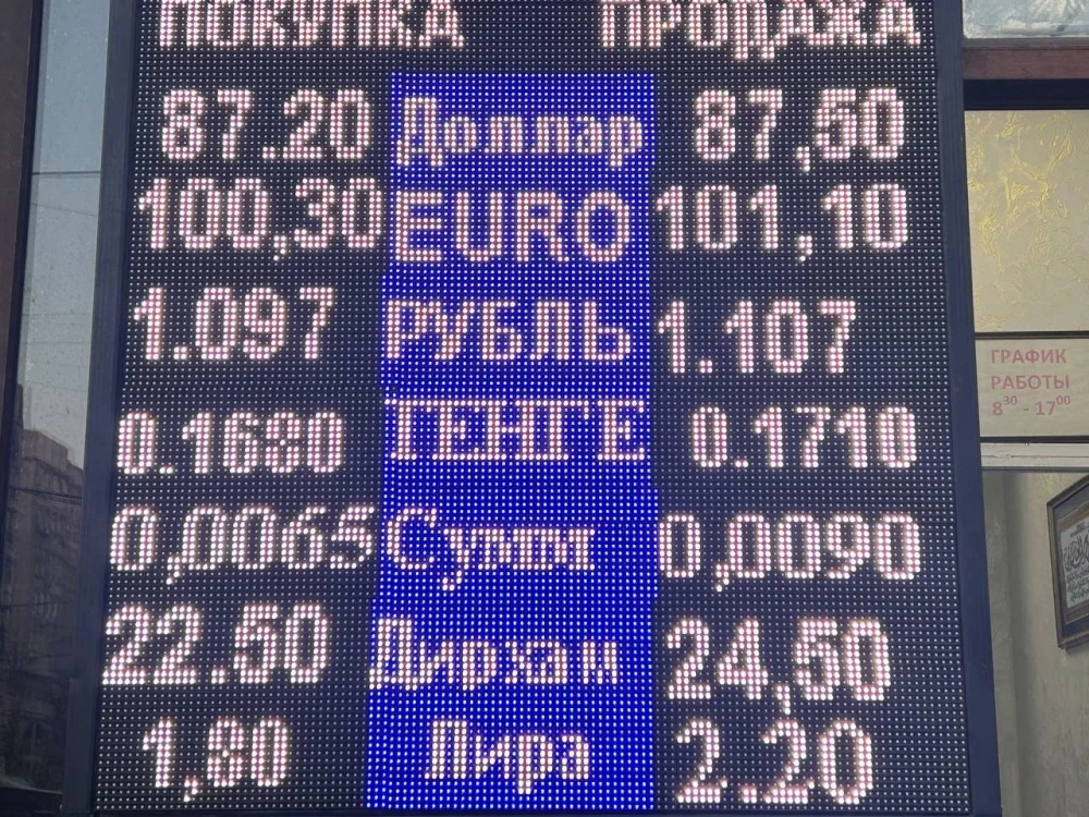 Рубль укрепился в цене: его можно купить за 1,09 сома, а продать — за 1,1 сома.