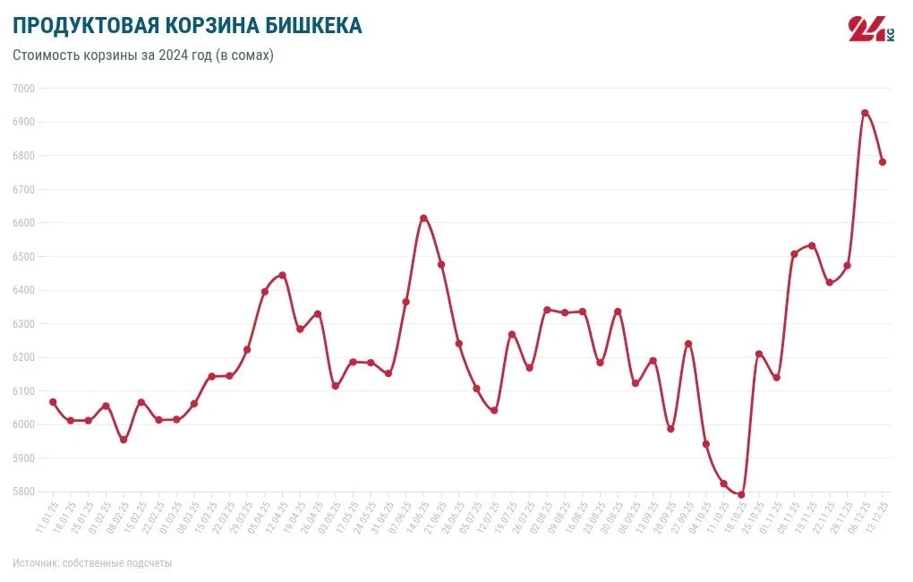 В 2024 году стоимость продуктовой корзины уменьшилась на 743 сома. Самая низкая цена была зафиксирована 14 сентября — 5 тысяч 510 сомов, а самой высокой корзина была 13 апреля — 7 тысяч 18 сомов.