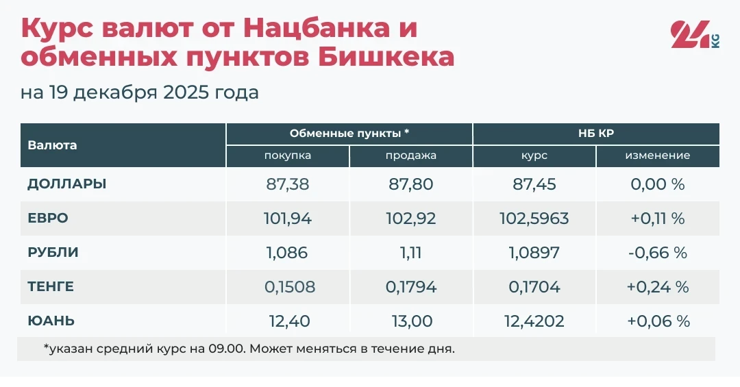 Национальный банк Кыргызстана и обменные пункты Бишкека сообщили о положительных изменениях курса евро, казахстанского тенге и китайского юаня, в то время как российский рубль продолжает падать. Доллар США остается стабильным.