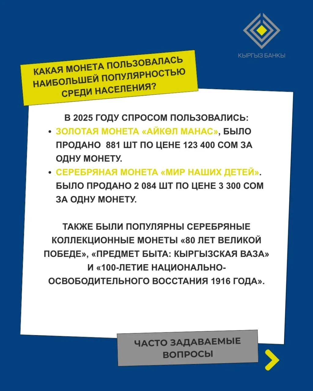 Кроме того, высоким спросом пользовались серебряные монеты, посвященные «80 лет Великой Победе», «Предмет быта: кыргызская ваза» и «100-летие национально-освободительного восстания 1916 года».