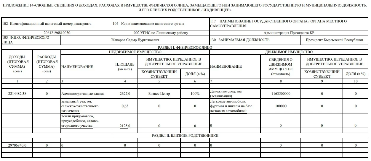 Согласно отчетам, президент Жапаров заработал 2 млн 214 тыс. 482,38 сома, однако информация о его расходах отсутствует. У него есть бизнес-центр площадью 2 627 квадратных метров, а также земельный участок сельскохозяйственного назначения размером 0,63 гектара и приусадебный участок площадью 2 125 квадратных метров.
