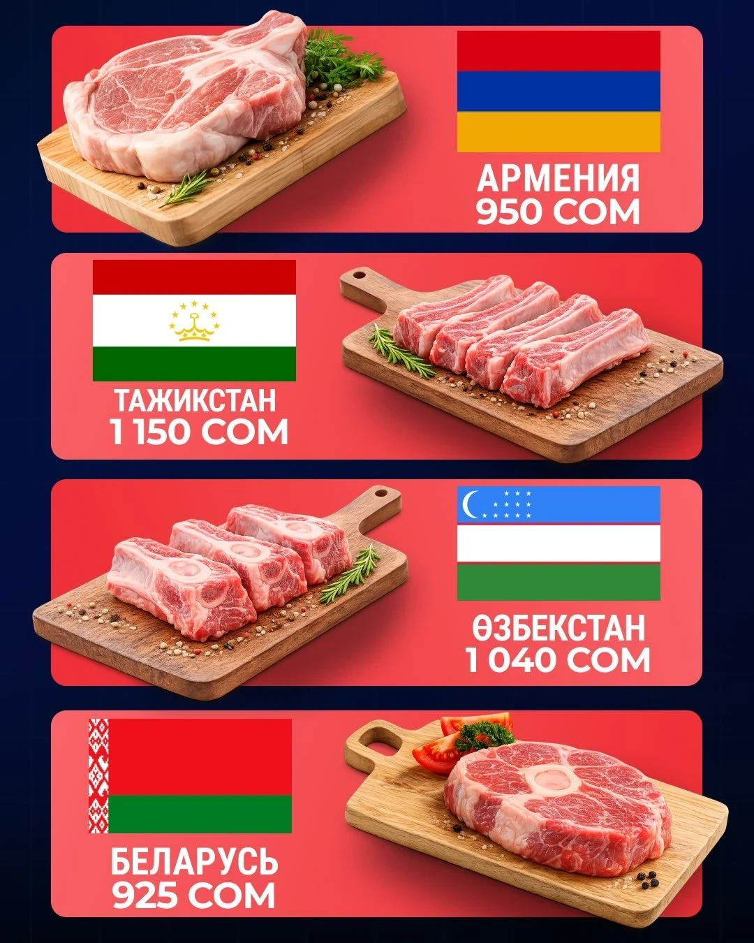 - Армения — 950 сомов;