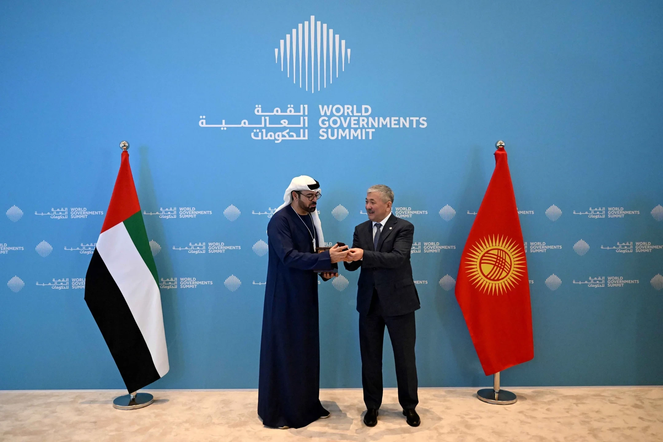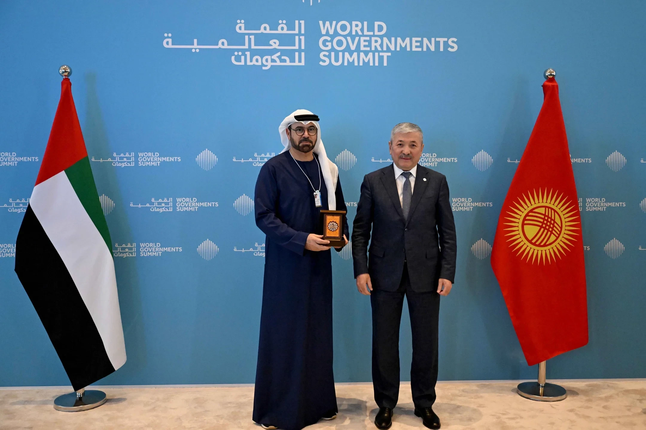 На саммите Касымалиев вручил министру по делам кабинета министров ОАЭ, председателю организации Всемирного правительственного саммита Мохаммеду Абдулле Аль-Гергави государственную награду Кыргызской Республики - Орден «Достук» за вклад в развитие дружбы и сотрудничества между Кыргызстаном и ОАЭ.