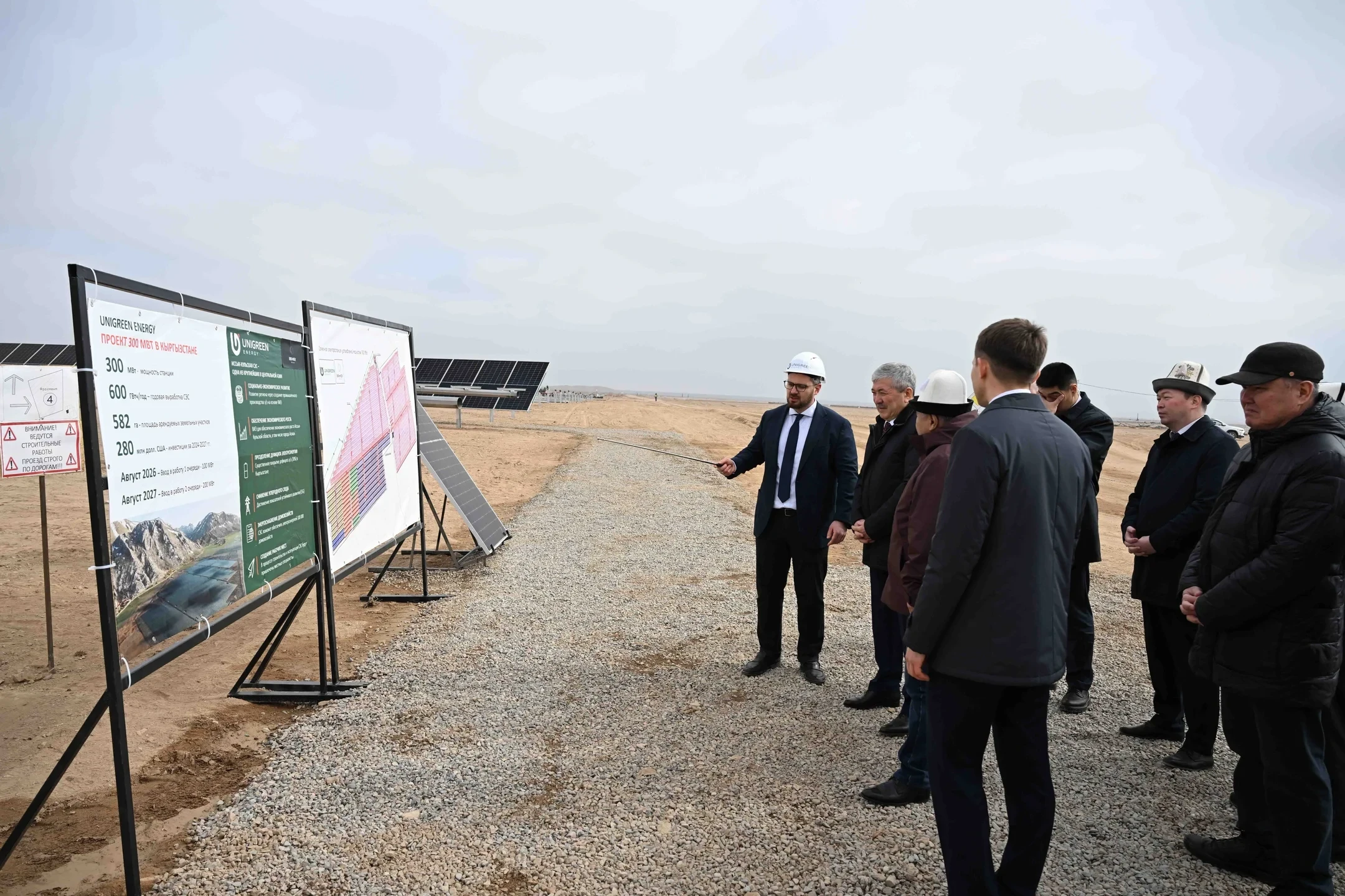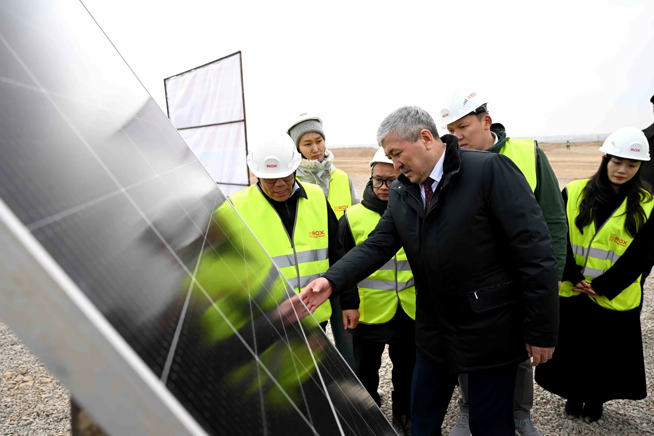 Следующим объектом, который посетил глава кабинета министров, стало строительство солнечной электростанции в селе Кызыл-Орук, реализуемое вьетнамской компанией «Рокс Энержи Глобал».