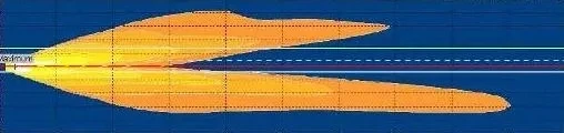 Иллюстрация правильного распределения света качественной лампы при ближнем свете (вид сверху). Луч света настроен так, чтобы не слепить встречные автомобили.
