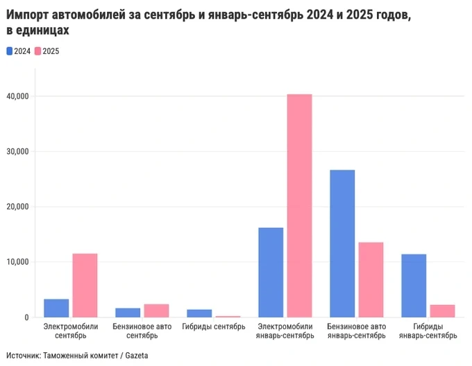 Импорт гибридных автомобилей остается на низком уровне: с января по сентябрь было завезено 2264 гибрида на сумму 55,1 миллиона долларов. Для сравнения, за аналогичный период 2024 года было поставлено 11,4 тысячи таких автомобилей (в пять раз больше) на 223,6 миллиона долларов.