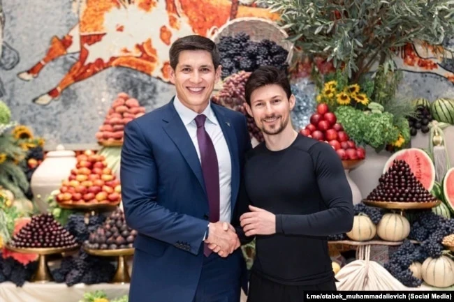 Младший зять президента Узбекистана Отабек Умаров (слева) с основателем мессенджера Telegram Павлом Дуровым. Ташкент, 27 июня 2024 года