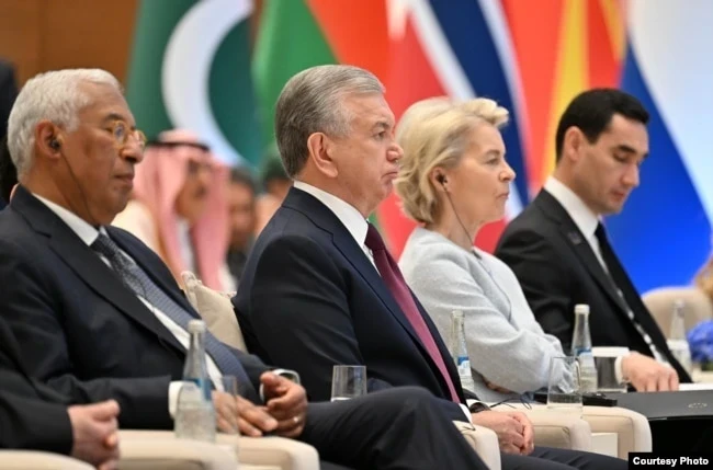 Президент Шавкат Мирзиёев и председатель Европейской комиссии Урсула фон дер Ляйен (вторая справа). Саммит Европейский союз — Центральная Азия. Самарканд, 3 апреля 2025 года