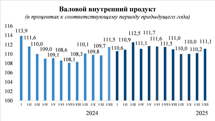 В 2025 году валовой внутренний продукт вырос на 11,1%, что подтверждает предварительная оценка. Общая сумма ВВП, как указано, превысила 1,9 триллиона сомов, что является значительным достижением по сравнению с 2024 годом.