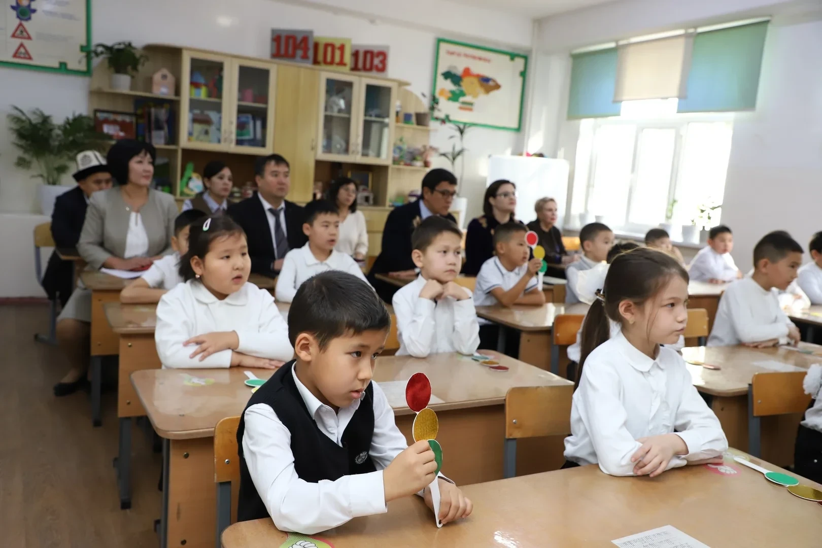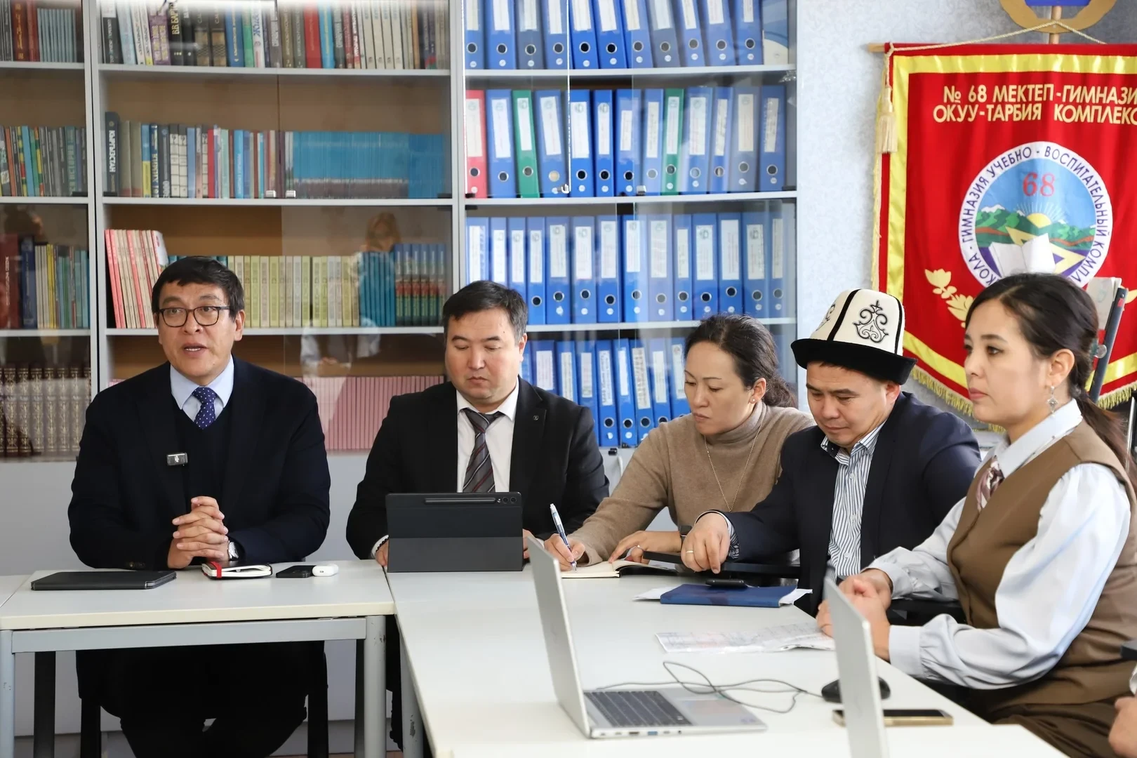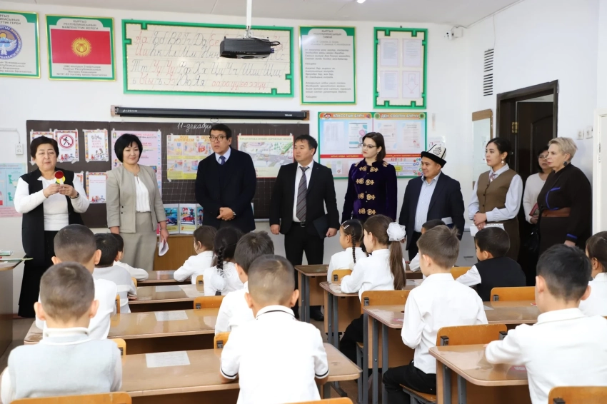 В Бишкеке заместитель председателя правительства КР Эдиль Байсалов посетил школу №68. В этом визите также участвовали первый заместитель министра образования Мухтарбек Баймурзаев, заместитель министра по цифровому развитию Лира Самыкбаева и вице-мэр столицы Виктория Мозгачева.