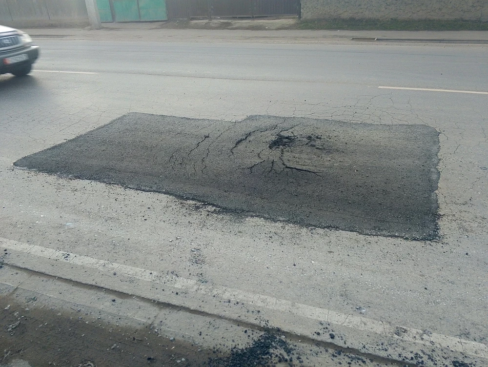 "Три дня назад на этой улице появилась огромная яма диаметром около двух метров. Сегодня дорожные рабочие сняли старый асфальт и укатали новый, но спустя два часа он оказался в таком состоянии", - написал он в обращении.