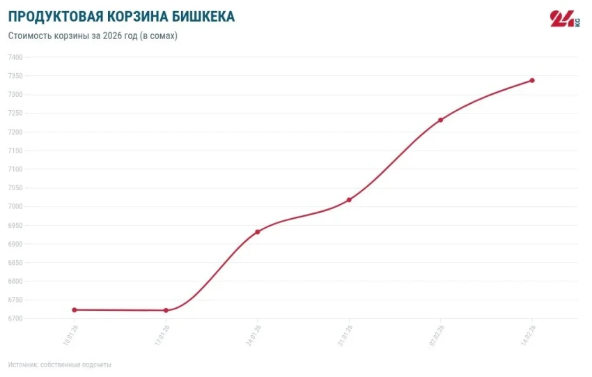 С начала нашего наблюдения в конце октября 2018 года, стоимость продуктовой корзины возросла на 4 тысячи 68 сомов. С начала текущего года рост составил 615 сомов, а по сравнению с аналогичным периодом 2025 года — 1 тысячу 272 сома.