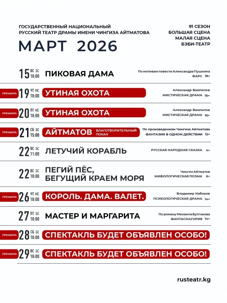 Репертуар Русского театра драмы им. Ч. Айтматова на март
