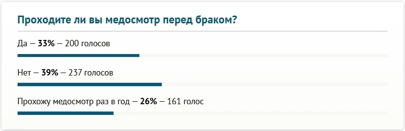 При этом одна треть участников опроса призналась, что проходили медосмотр перед заключением брака, тогда как немного большее количество опрошенных ответили отрицательно.