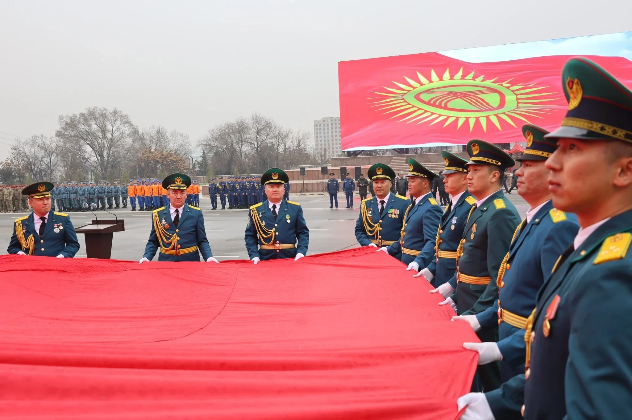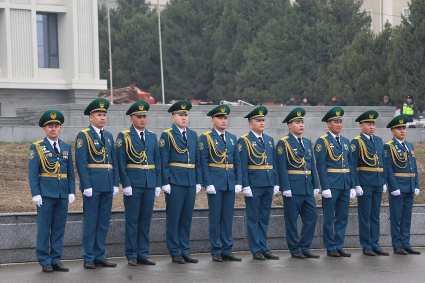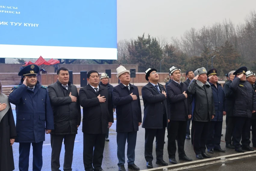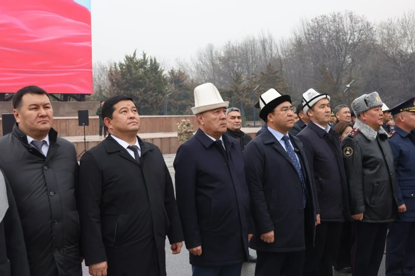 Во время церемонии военнослужащие подняли государственный флаг на центральной площади города под звуки гимна Кыргызской Республики.