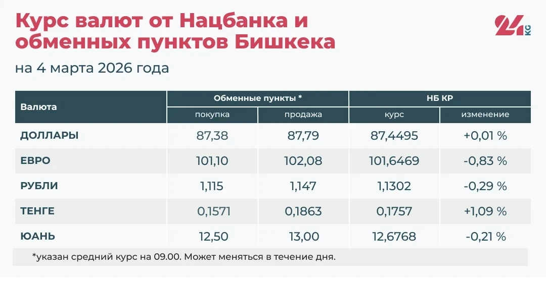- Официальный курс НБ КР: 87,4495 сома (увеличение на 0,01 процента).