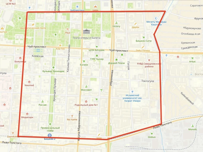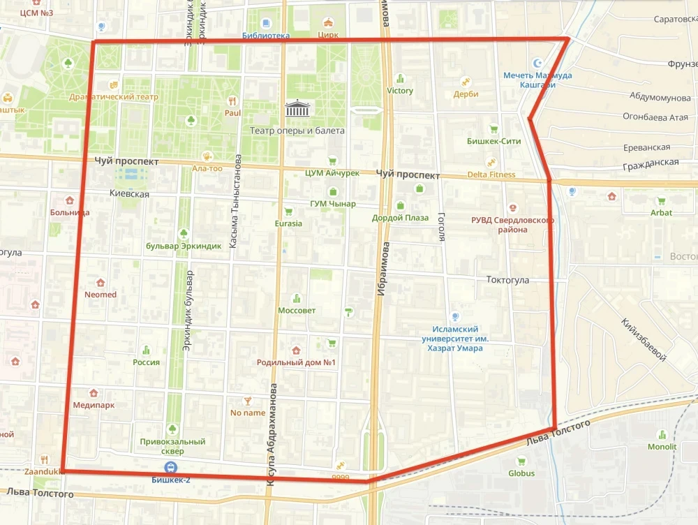 - по маршруту: линия железной дороги - ул. М. Фрунзе - река Аламедин - ул. Панфилова.