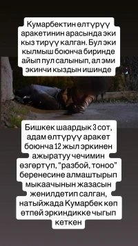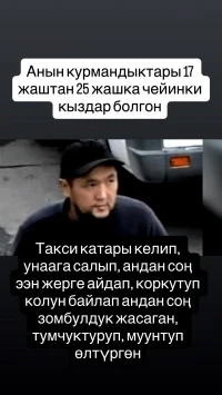 «Подозреваемого зовут Кумарбек. Он изнасиловал Айсулуу, а затем жестоко задушил ее. Вскоре стали известны и другие преступления, которые он совершал ранее. Кумарбек выдавал себя за таксиста и увозил девушек в возрасте от 17 до 25 лет в уединенные места, где насиловал и пытался задушить. Две девушки смогли выжить после его нападений», — сообщил Орунбеков.