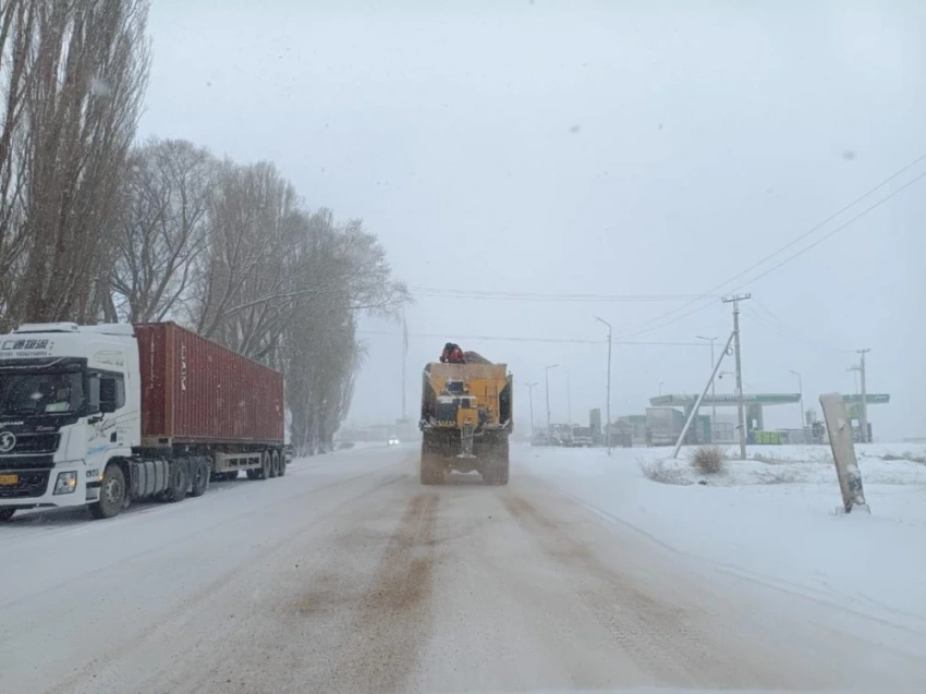 Государственные предприятия "Кыргызавтожол-Юг" и "Кыргызавтожол-Север" проводят посыпку дорог специальной песчано-соляной смесью.