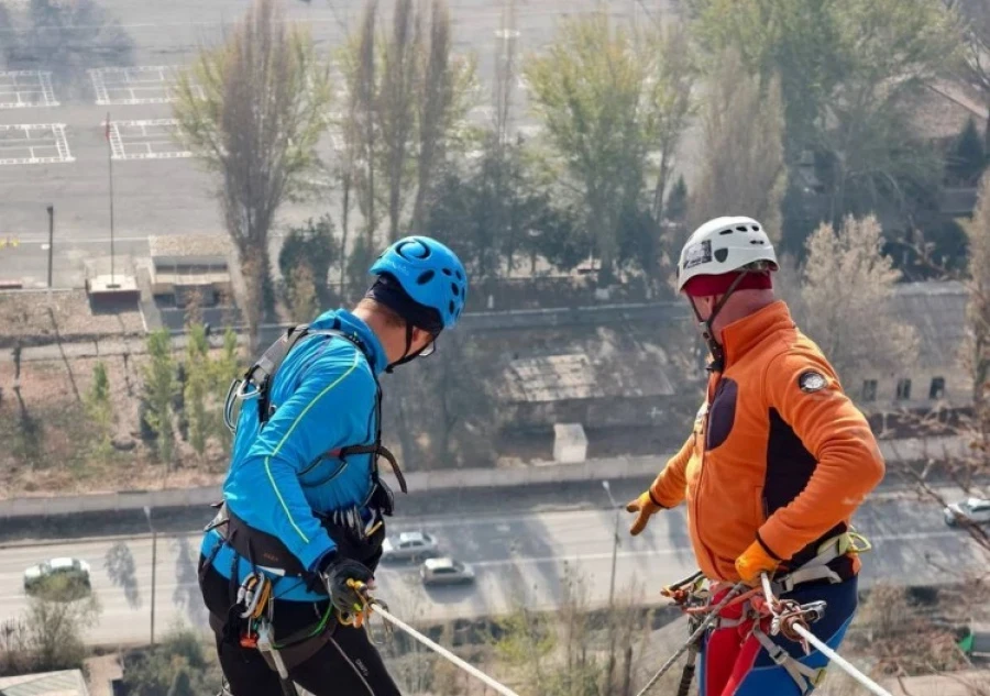На горе Керме-Тоо профессиональные альпинисты занимаются очисткой скального массива и размечают маршруты для предстоящих соревнований.