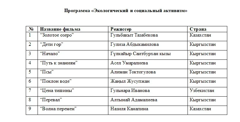 В эту программу вошли 16 фильмов, снятых женщинами-режиссерами из Кыргызстана, Казахстана, Узбекистана и Таджикистана.2. Программа "Экологический и социальный активизм"