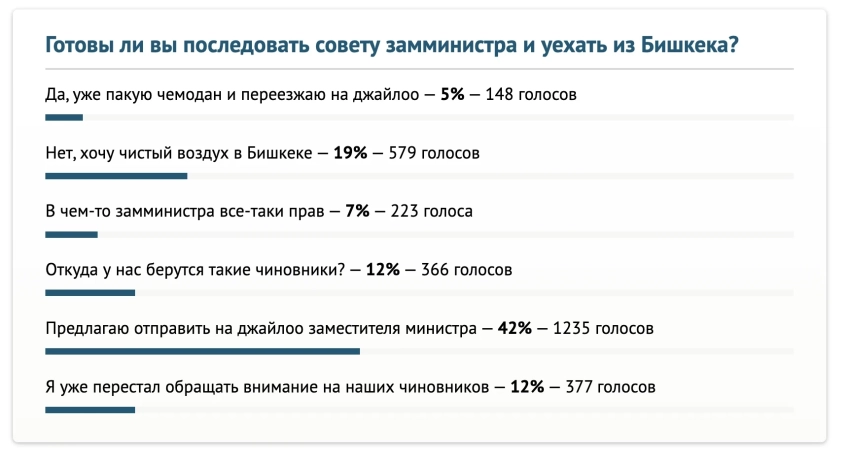 Результаты опроса показали, что 577 горожан (19 процентов) не намерены покидать Бишкек и требуют улучшения качества воздуха в городе. Также 147 респондентов заявили, что «уже начали собирать вещи».