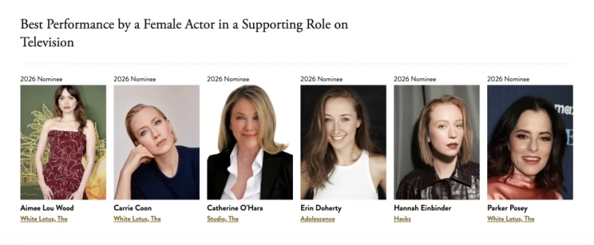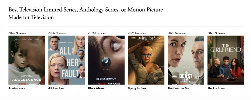 В категории сериалов лидирует "Белый лотос" с шестью номинациями, в то время как "Переходный возраст" имеет пять, а "Убийства в одном здании" и "Разделение" — по четыре.