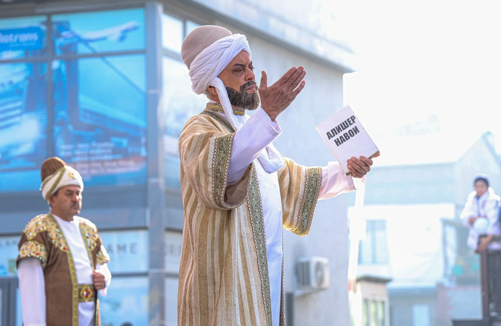 На церемонии присутствовали мэр Ошской области Женишбек Токторбаев, полномочный представитель президента Аманкан Кенжебаев, председатель городского кенеша Болот Баетов, замминистра культуры, информации и молодежной политики Аскаралы Мадаминов, а также делегация из Узбекистана во главе с министром культуры Озодбеком Назарбековым и хокимом Андижанской области Шухратом Абдурахмановым, наряду с местными жителями.