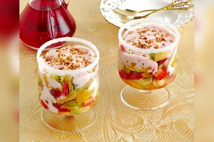 Фруктовые салаты лучше всего подавать в прозрачных фужерах, предварительно украсив их краями, обмакнув в яичный белок и сахар.