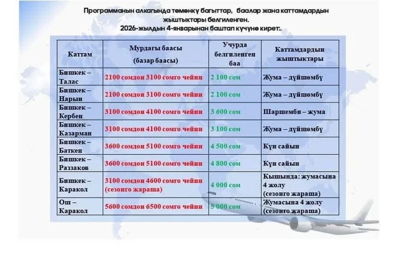В соответствии с указанием президента Садыра Жапарова, на 2026 год предусмотрено установление цен на авиаперевозки по внутренним маршрутам ниже рыночных. Разница в стоимости авиабилетов будет покрыта средствами Стабилизационного фонда.