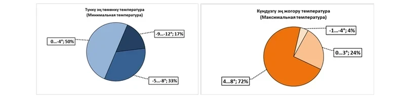 В этом месяце ожидается, что средняя температура воздуха будет на 1-2 градуса выше климатической нормы и составит от 0 до 2 градусов тепла, в то время как в предгорных зонах и в Кеминской долине температура может опуститься до -1…-3 градусов мороза.