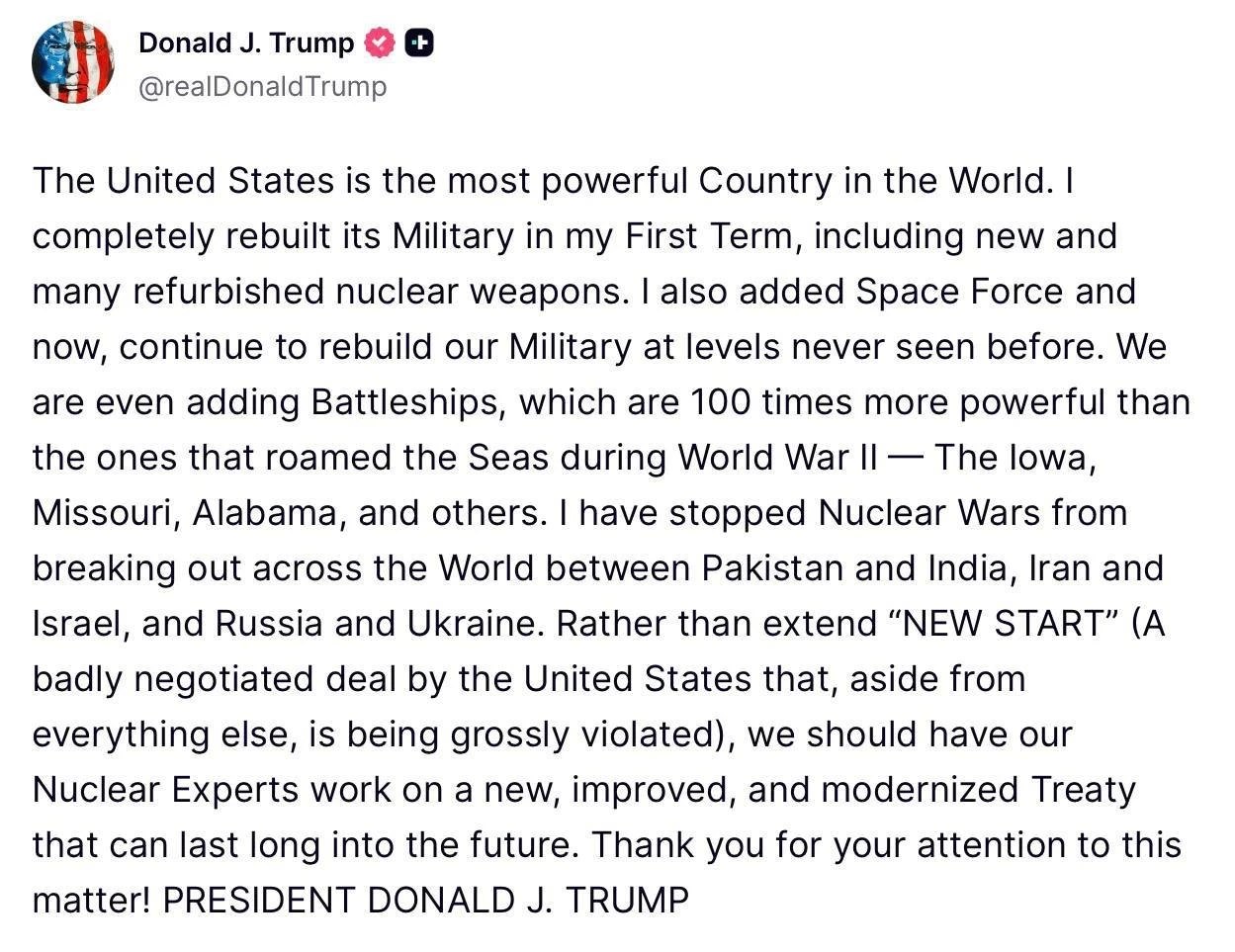 Он подчеркнул: «Я предотвратил ядерные конфликты в разных регионах, включая Пакистан и Индию, Иран и Израиль, а также Россию и Украину. Вместо того чтобы продлевать «Новый Договор СНВ», который был плохо согласован и нарушается, мы должны поручить нашим специалистам по ядерным вопросам создать новый, более эффективный и современный договор, который будет работать в долгосрочной перспективе», — заявил Трамп.