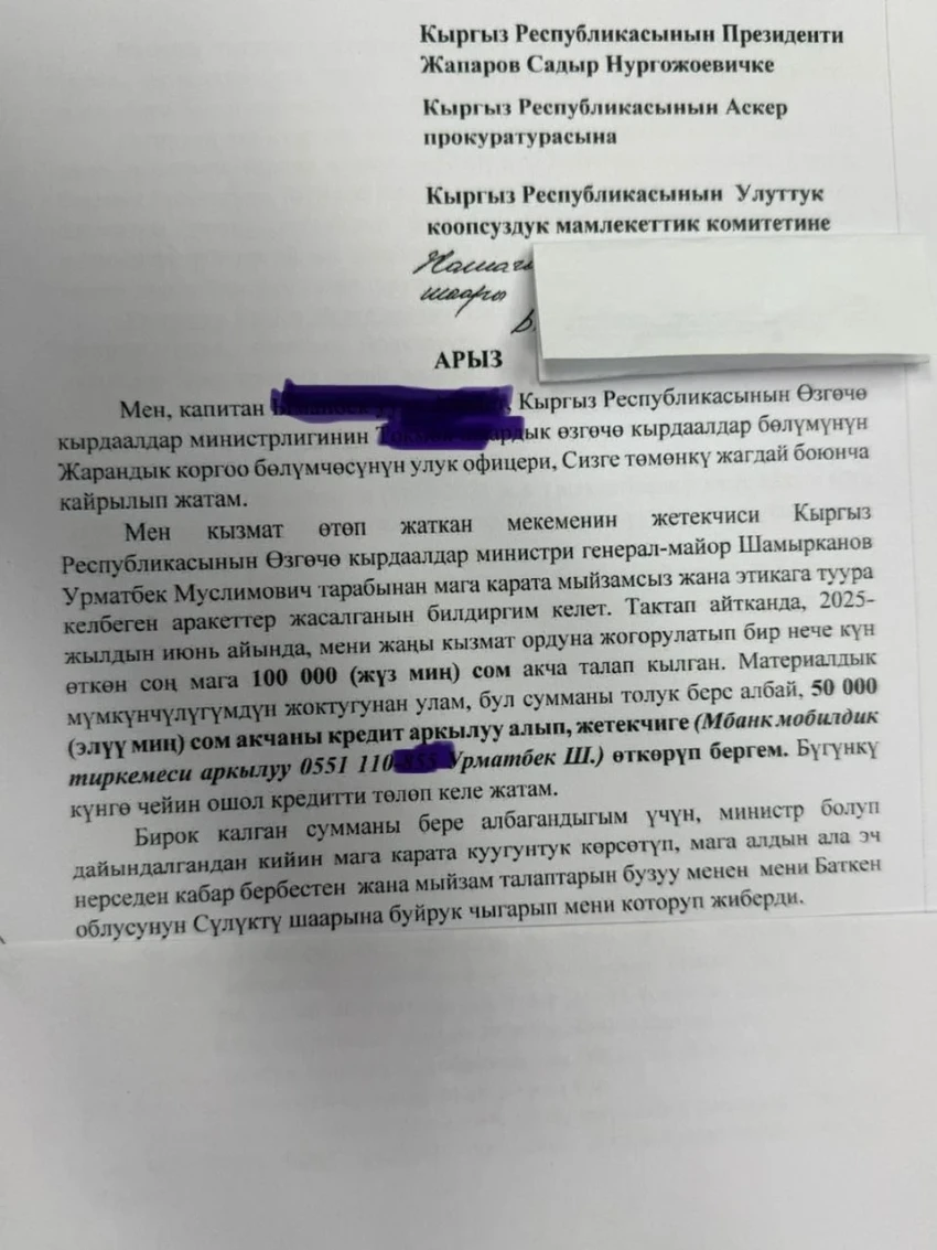 Согласно информации, в летний период 2025 года Шамырканов якобы потребовал взятку за продвижение по службе одного из сотрудников министерства. Работник утверждает, что половину указанной суммы он перевел на электронный кошелек Шамырканова.