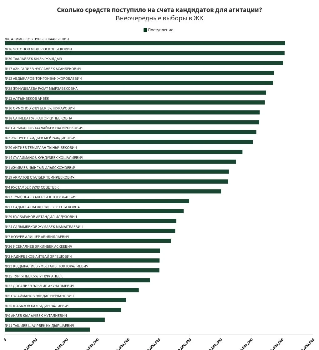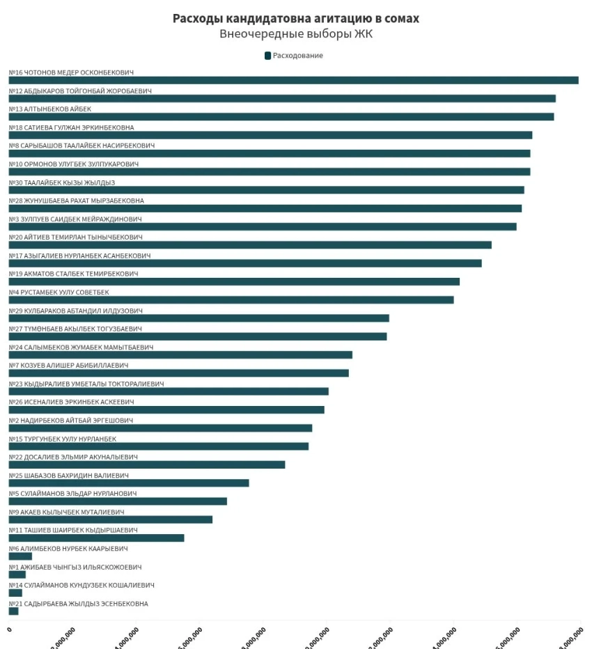 В эту сумму включены затраты на оплату труда сотрудников штаба, агитаторов, производство агитационных материалов и другие расходы. Кандидаты обязаны еженедельно предоставлять отчеты о своих расходах и поступлениях, не превышая установленный лимит.Kaktus.media проанализировало отчеты всех кандидатов и определило, кто из них потратил наибольшие и наименьшие суммы на агитацию. Важно отметить, что некоторые кандидаты указали сумму в 300 тыс. сомов за регистрацию в ЦИК, которая является отдельным платежом. Также у некоторых из них были возвратные платежи, но они не оказали значительного влияния на общую статистику.