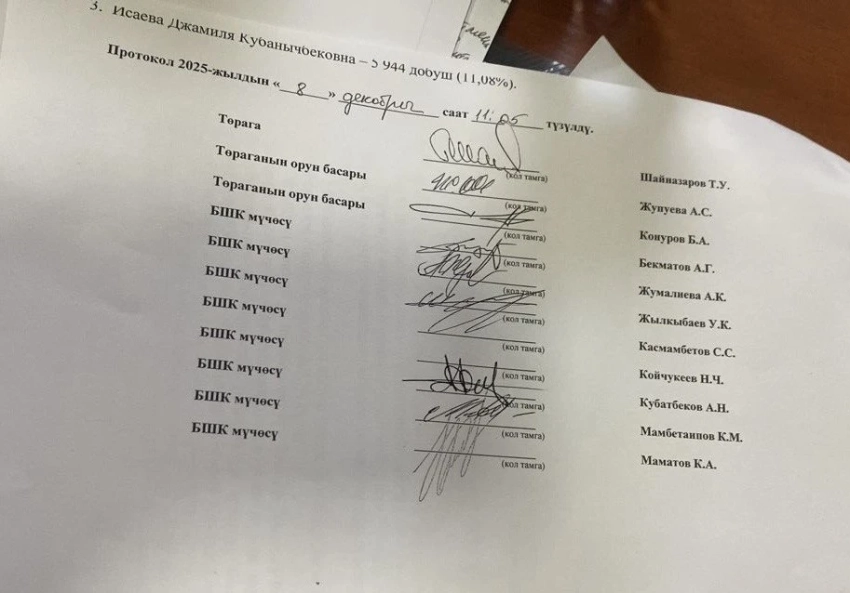 По словам Абакирова, в протоколе, представленном представителем ЦИК, имеются признаки фальсификации: некоторые подписи выглядят как будто были поставлены в спешке, а некоторые, возможно, были скопированы. Кроме того, время, указанное в документе — 8 декабря в 11:05, не совпадает с фактическим временем начала заседания, которое состоялось в 17:00, что подтверждается повесткой на сайте ЦИК.