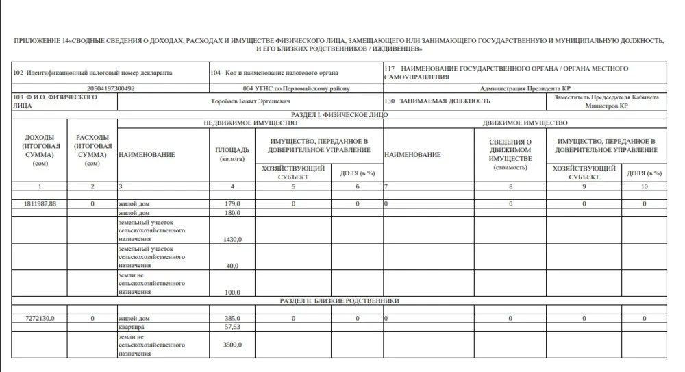 Согласно его декларации, доход Торобаева в 2024 году составил 1 миллион 811,9 тысячи сомов, при этом он не указал никаких расходов — в этом разделе стоит ноль.