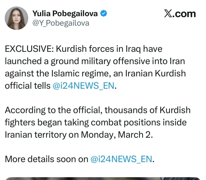Израильская журналистка Юлия Побегайлова сообщила о начале наступления курдских сил Ирака на Иран.