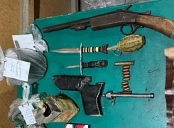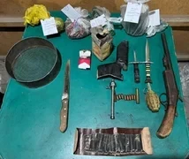 При обыске в доме задержанного были найдены два пакета с коричневым веществом, обладающим характерным запахом конопли, весом 138 и 102 грамма; самодельная трубка для курения, пластиковая бутылка, самодельный пистолет, обрез, граната, восемь патронов, один патрон, одна гильза и коробка с порохом; два ножа.
