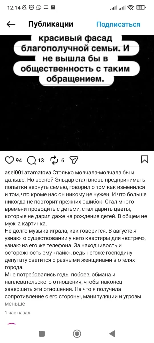 В своем сообщении Асель упоминает о систематическом насилии со стороны парламентария, которое, по ее словам, началось после его избрания в начале 2022 года.