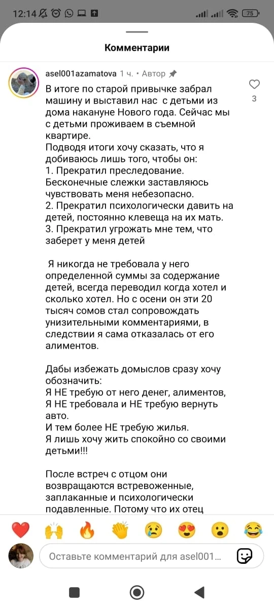Она также подчеркнула, что стремится к тому, чтобы Эльдар Сулайманов прекратил преследование, психологическое давление на их детей и угрозы о том, что заберет детей.