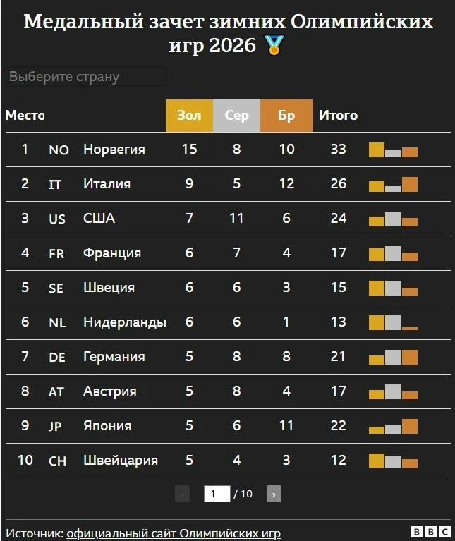 По итогам 12 дней соревнований Норвегия сохраняет лидерство в медальном зачете, за ней следуют Италия и США. Первую пятерку замыкают Китай и Швеция. Конкуренция усиливается, и каждый старт способен изменить расстановку сил на пьедестале.