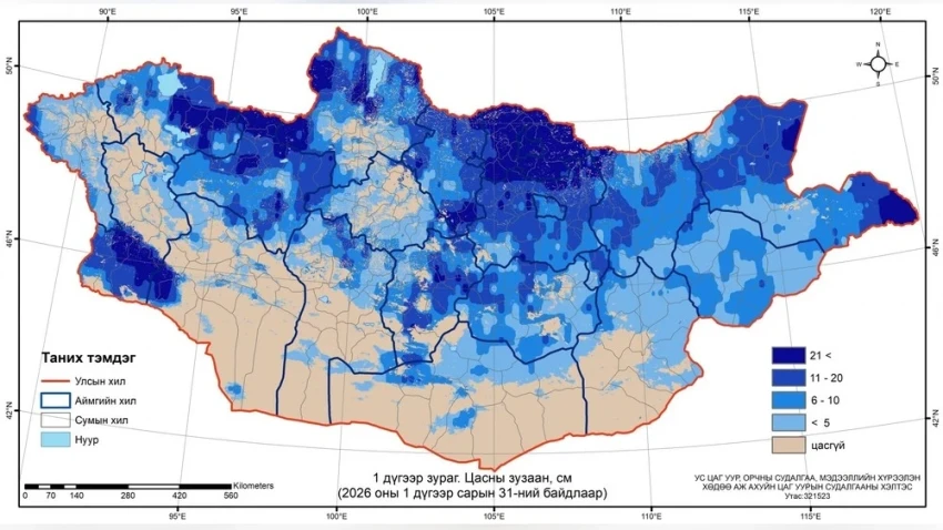 Наибольшая толщина снежного покрова, достигающая 31-47 см, наблюдается в районах Ховд, Цагаанхайрхан, Хяргас, а также в сомонах Цэцэн-Уул, Баянтэс, Нөмрөг аймака Завхан, в сомонах Цэцэрлэг и Алаг-Эрдэнэ Хөвсгөл, а также в районах Ерөө, Орхонтуул, Орхон, Хюдэр и Цагааннуур Сэлэнгэ. Сравнение с предыдущими десятью днями показывает снижение снежного покрова на 14%.