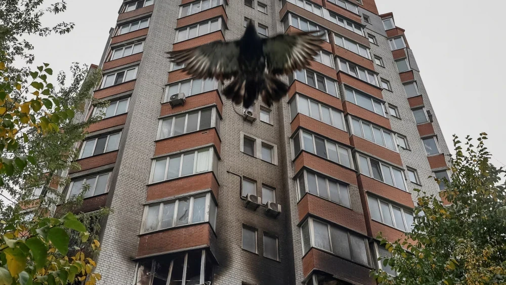 Голубь на фоне здания, поврежденного при атаке дронов в Киеве. Фото Alina Smutko / Reuters.